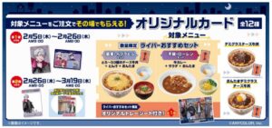 全国のすき家店舗で、対象期間中に指定メニューを注文すると、オリジナルカードがもらえるほか、限定グッズが当たるキャンペーンなどが実施されます。